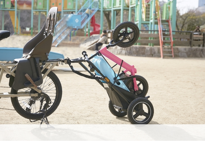 子ども乗せ自転車でもけん引できて、スムーズな走行を実現したサイクルトレーラー。